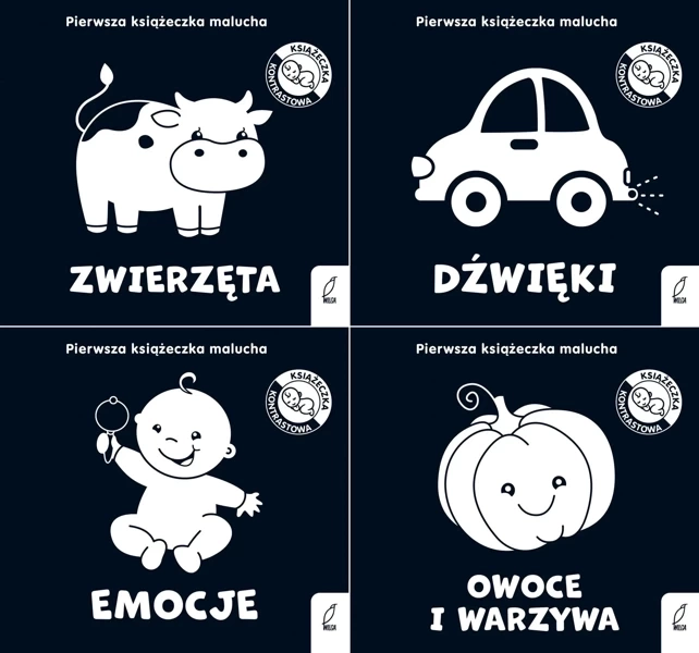 Maluszek widzi świat dwuwymiarowo i nieostro. Ilustracje oparte na czarno-białym kontraście pomagają ćwiczyć jego oko. To idealny sposób, aby wspomagać rozwój swojej pociechy już od pierwszych miesięcy życia.