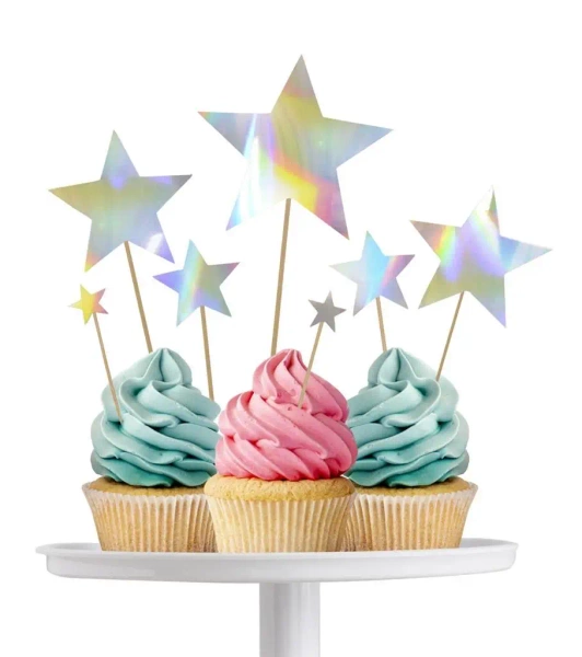 Atrakcyjne gwiazdki na drewnianych patyczkach z dodatkiem opalizującego efektu. Doskonale sprawdzają się jako ozdoby dla różnego rodzaju ciast oraz babeczek. W jednym opakowaniu znajduje się aż 7 sztuk tych świetnych ozdób. Ich rozmiary różnią się od 6 do 14,5 centymetrów.