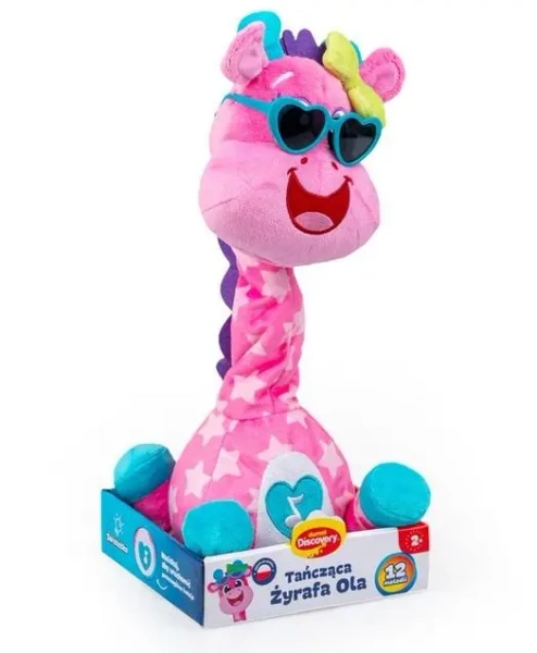 "Tańcząca żyrafa" z serii zabawek Ola to prawdziwy król imprez! Kolorowa i zabawna, potrafi bawić się tańcząc do aż 12 melodii, które odtwarza. Ruchoma szyja żyrafy w rytm muzyki, zapewnia dodatkową porcję radości. Ta interaktywna zabawka posiada również ruchome okulary, które można odsłonić oczka żyrafy. Centralnym elementem sterującym jest świecący przycisk, ozdobiony gwiazdką. W trakcie odtwarzania muzyki, przycisk mieni się różnymi kolorami.
