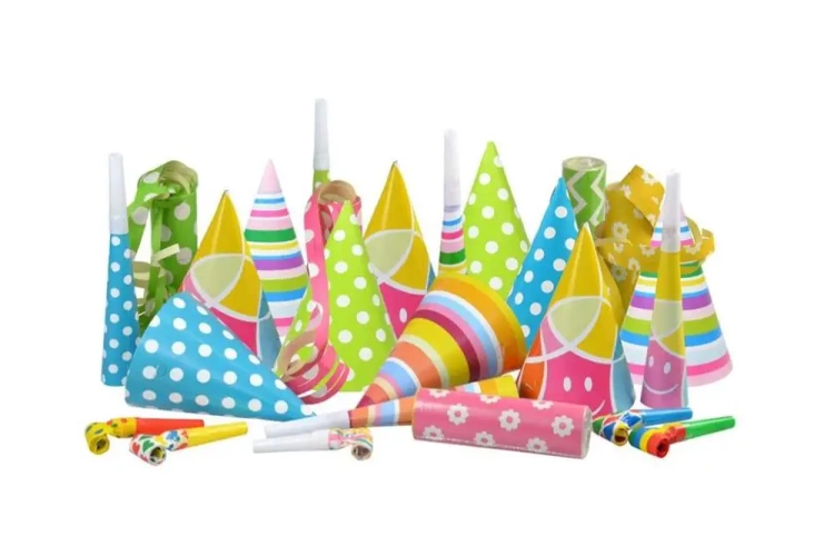 W zestawie imprezowym znajdują się różne gadżety takie jak: czapeczka o średnicy 10 cm i wysokości 16 cm, trąbka mierząca 19 cm, gwizdek o długości 9 cm (po rozłożeniu ma wymiary 2,5x35 cm), a także 18 zwojów serpentyn.