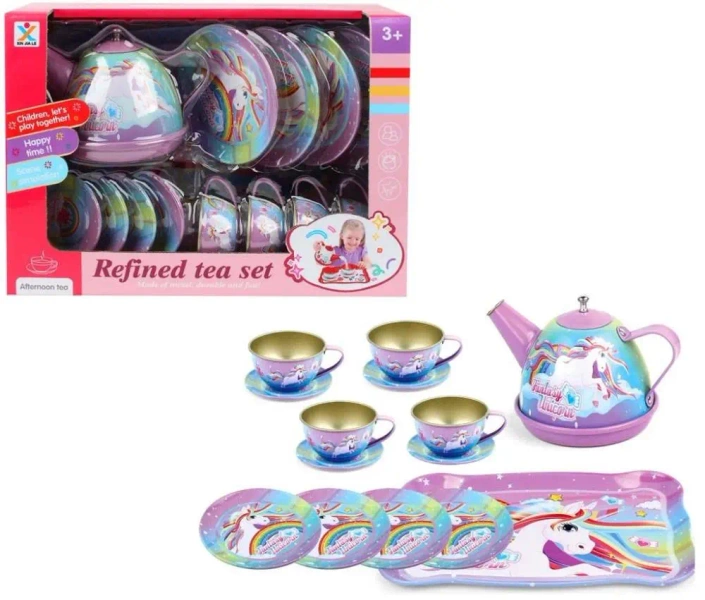 Ręcznie malowany, metalowy zestaw do parzenia i podawania herbaty, ozdobiony kolorową grafiką jednorożca. Komplet składa się z 24 części: cztery urocze filiżanki z koordynującymi podstawkami, cztery deserowe talerzyki, elegancki czajnik do herbaty oraz funkcjonalna taca.