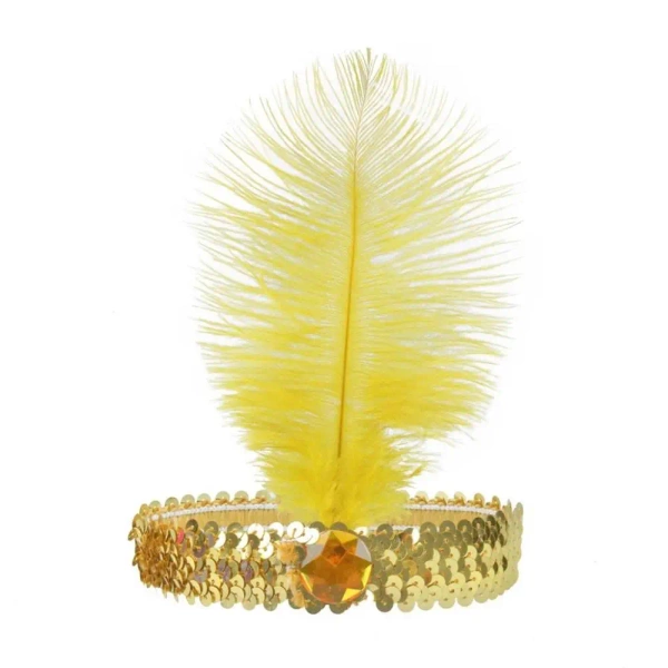 Zdobiona cekinami elastyczna opaska na głowę, uwieńczona piórem i kolorowym kamieniem. Jest to perfekcyjny dodatek, który dopełni strój każdej damy, ubranej w stylu lat dwudziestych. Obwód opaski wynosi 56cm.