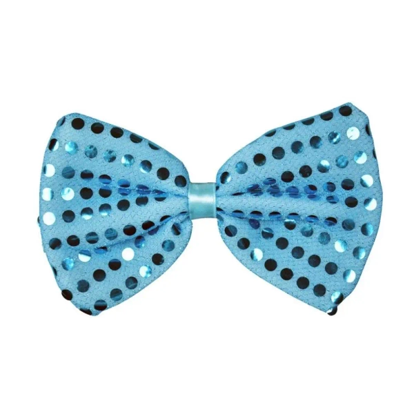 Prezentujemy lśniącą muszkę w kolorze błękitu. Ten dodatek do stylizacji został ozdobiony błyszczącymi punktami. Przystosowanie muszki do szyi odbywa się przez rozciągliwą opaskę, co zapewnia komfort noszenia i łatwość użycia. Idealny szczegół dla kreacji na bal karnawałowy, event tematyczny czy party w disco stylu. Rozmiar oferowanej muszki to 14x9 cm.