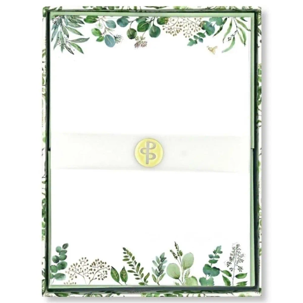 Prezentowany tu zestaw do korespondencji z oferty marki Peter Pauper Press to elegancko opakowany komplet wysokiej jakości papeterii. Wewnątrz znajdują się kartki o identycznych, jednostronnych nadrukach oraz dopasowane kolorystycznie koperty. Wzory na kartkach są podkreślone za pomocą złotej folii oraz są tłoczone. Po złożeniu na pół, każda kartka idealnie wpasowuje się do załączonej koperty.