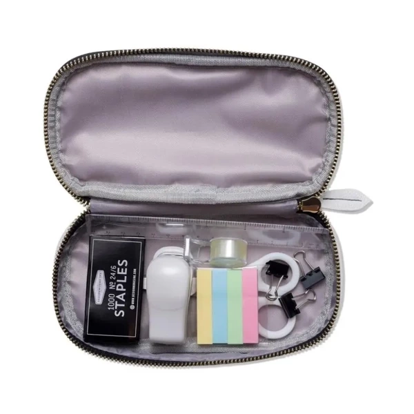 Zestaw składa się z takich elementów jak: linijka, mini zszywacz, małe pudełko zapasowych zszywek, mini dystrybutor na taśmę, nożyczki, klamry do segregatorów oraz zakładki do książek - wszystko upakowane w miękki, designerki futerał z wegańskiej skóry. Dodatkowym atutem jest praktyczny, elastyczny pasek, który idealnie zmieści Twój telefon. Zestaw jest tak kompletny, że naprawdę nie będziesz potrzebować nic więcej.