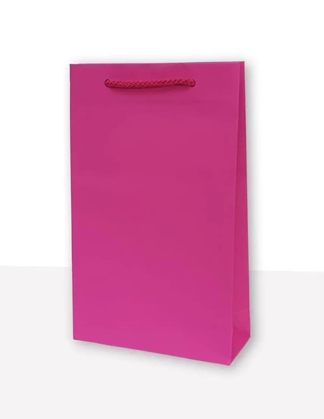 Prezentujemy jednobarwną torbę w kolorze różowym, która doskonale sprawdzi się jako opakowanie na wyjątkowe okazje. Torebka o wymiarach 26 cm wysokości, 16 cm szerokości oraz 6,5 cm głębokości, wykonana jest z wytrzymałego, barwionego w masie papieru o gramaturze minimum 120g/m2.