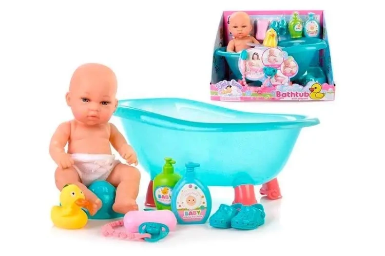Zestaw obejmuje lalkę o wysokości 30 cm, wannę o długości 39 cm, nocnik, gumową kaczkę, dwie buteleczki, kapcie, mydło oraz smoczek na łańcuszku. Wymiary opakowania to 40 x 28,5 x 23,5 cm.
