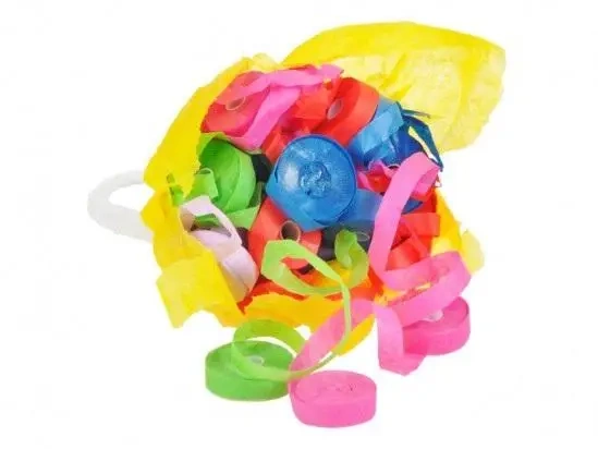 Prezentujemy Wam worek wypełniony papierowymi serpentynami, gotowymi do ręcznego rzutu. W środku znajduje się aż 29 sztuk serpentyn, z których każda ma długość 6 metrów.