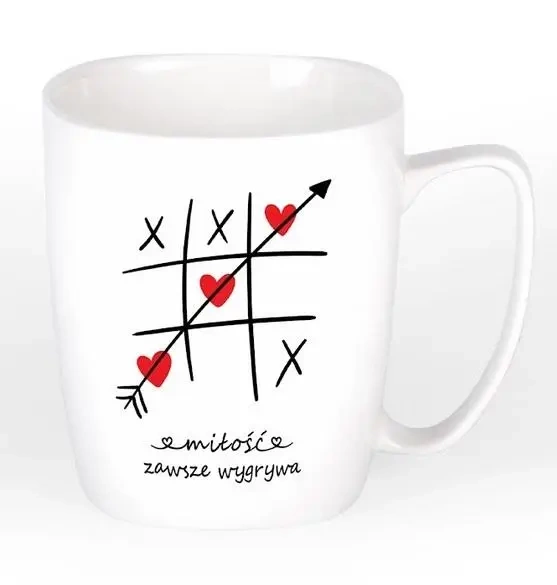 Kółko, krzyżyk? Nie, miłość! Bo serce, w odróżnieniu od rozumu, zawsze wygrywa! Kubek z nadrukiem MIŁOŚĆ ZAWSZE WYGRYWA to wyjątkowy pomysł na prezent ślubny, walentynkowy czy z okazji rocznicy związku. Równie dobrze sprawdzi się jako prezent urodzinowy dla chłopaka lub prezent dla dziewczyny na Dzień Kobiet. Podaruj go drugiej połówce, która jest miłośniczką kawy. Kubek do kawy MIŁOŚĆ ZAWSZE WYGRYWA został wyprodukowany od A do Ż w Polsce z miłości do kawy. W sam raz na romantyczny prezent z okazji walentynek! Kubek z porcelany Pojemność: 380 ml Pojemność użytkowa: 360 ml Zapakowany w szykowny kartonik Idealny prezent na walentynki dla niej i dla niego Nadruk po dwóch stronach kubka, logo na spodzie Można myć w zmywarce