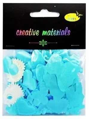Prezentujemy miks aplikacji tekstylnych, idealny na chrzciny. W zestawie znajdują się takie elementy jak: smoczki, buteleczki, śliniaczki, wózeczki, śpioszki, serduszka oraz napisy "Baby". Każde opakowanie, które jest elegancko zapakowane i wyposażone w eurozawieszkę oraz kod kreskowy, zawiera 4 gramy różnorodnych ozdób. Produkty są dostępne w jasnoniebieskim kolorze.
