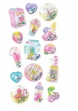 Każda naklejka została zaprojektowana z przezroczystą, wypukłą kopułką, wypełnioną opalizującym konfetti w kształcie serduszek, gwiazdek i kwiatków, co nadaje dodatkowej głębi oraz efektu 3D.