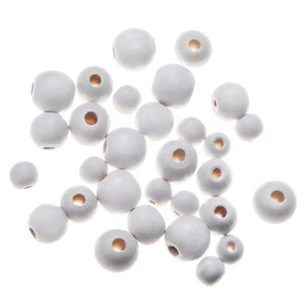 Białe, drewniane koraliki w formie kulek są perfekcyjnym dodatkiem do różnorodnych projektów DIY.