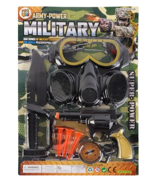 - Maska przeciwgazowa: Wyposażona w atrapę filtrów, daje poczucie realistycznej zabawy w role.