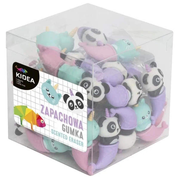 Seria zapachowych gumek KIDEA to idealny wybór dla najmłodszych. Radosne kształty, takie jak panda-syrenka czy kotek-syrenka, sprawiają, że są one nie tylko praktyczne, ale również urocze. Dodatkowym atutem jest ich przyjemny zapach truskawki i karmelu, który umili każdą chwilę spędzoną na rysowaniu i pisaniu.