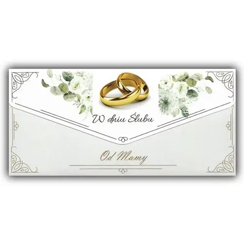 Elegancki karnet ślubny o formacie DL, który wyróżnia się niezwykłymi złoceniami. W środku znajdziesz piękne życzenia oraz praktyczną kieszonkę na pieniądze. Do zestawu dołączona jest także dodatkowa koperta.