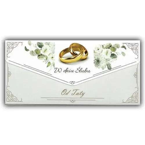 Ten elegancki karnet ślubny, po złożeniu, ma format DL. Został wzbogacony o wyjątkowe złocenia, które dodają mu niepowtarzalnego blasku. Wewnątrz karnetu znajdują się starannie dobrane życzenia oraz praktyczna kieszonka na pieniądze. W zestawie znajduje się również dodatkowa koperta, co sprawia, że karnet jest gotowy do wręczenia.