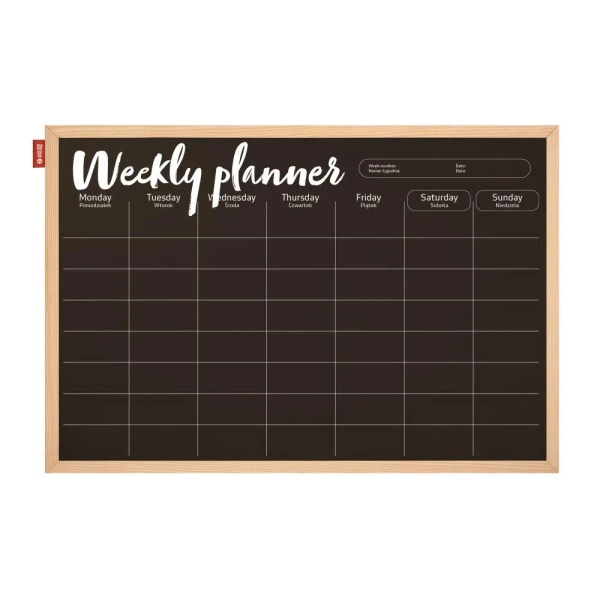 - czarna powierzchnia z nadrukowanym w kolorze białym harmonogramem, który pozwala na planowanie zadań tygodniowych