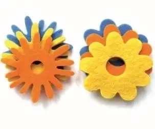 W zestawie znajduje się sześć kwiatków wykonanych z filcu o dwóch różnych formach. Produkty dostępne są w trzech barwach: niebieskiej, pomarańczowej oraz żółtej.