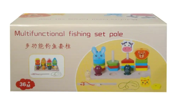 Drewniana zabawka 2 w 1 dla dzieci. Dzięki niej dzieci będą ćwiczyć zręczność, a także poznają kształty i kolory. Zabawka posiada: - grę rybki polegającą na łowieniu rybek za pomocą kijka z magnesem, - grę polegającą na rozróżnianiu kształtów i układaniu piramidek. Produkt dla dzieci od 3 lat. Zabawka zapakowana w kartonowe opakowanie. Podane wymiary są wymiarami opakowania.