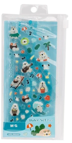 Ten praktyczny zestaw geometryczny składa się z czterech elementów: linijki o długości 15 cm, dwóch ekierków oraz kątomierza. Idealny do użytku w szkole, ale także w domu i pracy.