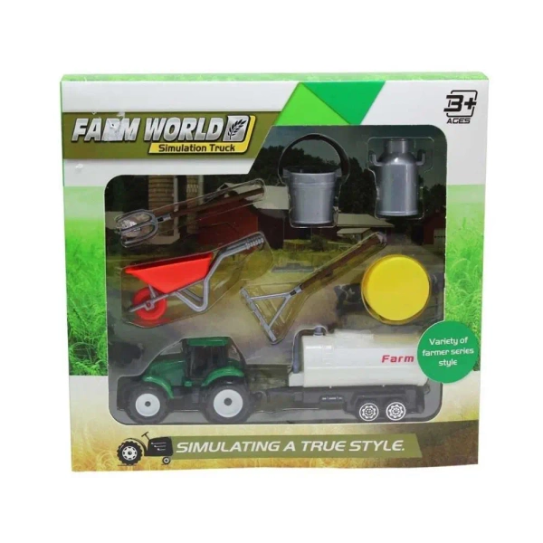 W zestawie znajdziesz traktor, przyczepę oraz akcesoria niezbędne do pracy na farmie.