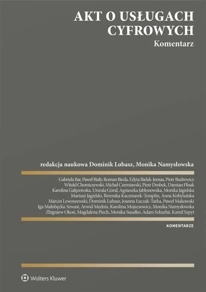 Komentarz zawiera najbardziej kompleksowe na rynku opracowanie i wyjaśnienie regulacji aktu o usługach cyfrowych, ze wskazaniem kierunków wykładni, ułatwiających wdrożenie przepisów przez podmioty zobowiązane, przed wszystkim oferujących usługi pośrednie online, jak i stosowanie zarówno przez komercyjnych użytkowników usług cyfrowych, jak i organy nadzorcze. Opracowanie w sposób szczegółowy omawia nowe regulacje, które mają na celu w szczególności: zwalczanie nielegalnych treści online, w tym odnoszących się do nielegalnych towarów i usług, wzmocnienie pozycji użytkowników i ich przedstawicieli, w tym przez zapewnienie możliwości zgłaszania nielegalnych treści, zakwestionowania decyzji o moderowaniu treści i dochodzenia zadośćuczynienia za pośrednictwem mechanizmu rozstrzygania sporów lub zadośćuczynienia sądowego, wprowadzeniu obowiązków systemowej oceny i mitygowania ryzyka nakładanych na VLOP i VLOSE oraz zabezpieczenia dzieci oraz ograniczenia w wykorzystywaniu wrażliwych danych osobowych do celów reklamy targetowanej; wzmocnienie nadzoru i egzekwowania przepisów wobec wszystkich dostawców usług pośrednich, przy istotnej roli niezależnych koordynatorów ds. usług cyfrowych w każdym państwie członkowskim UE i Europejskiej Rady ds. Usług Cyfrowych, a ponadto wyposażenie Komisji Europejskiej w dodatkowe uprawnienia nadzorcze w odniesieniu do VLOP i VLOSE. Wkład w opracowanie komentarza wniosło prawie 30 autorów o rozległych kompetencjach merytorycznych z zakresu problematyki nowych technologii, usług cyfrowych, ochrony danych osobowych, będących praktykami z Parlamentu Europejskiego, Komisji Europejskiej, Urzędu Ochrony Danych Osobowych, Kancelarii Sejmu, ekspertów Europejskiej Rady Ochrony Danych, organizacji branżowych, jak i doradcami prawnymi z renomowanych kancelarii prawnych oraz z działów prawnych dużych przedsiębiorstw internetowych, przedstawicielami nauki polskiej i międzynarodowej z wiodących uczelni. Komentarz przeznaczony jest dla dostawców usług pośrednich (dostawców dostępu do internetu, usług hostingowych, takie jak przetwarzanie w chmurze, rejestratorów nazw domen, internetowych, platform handlowych, sklepów z aplikacjami, sieci społecznościowych, platform udostępniania treści, internetowych platform podróży i zakwaterowania), a także dostawców bardzo dużych platform internetowych i bardzo dużych wyszukiwarek internetowych. Publikacja będzie przydatna również prawnikom praktykom - radcom prawnym, adwokatom, sędziom, a także pracownikom administracji rządowej i samorządowej.