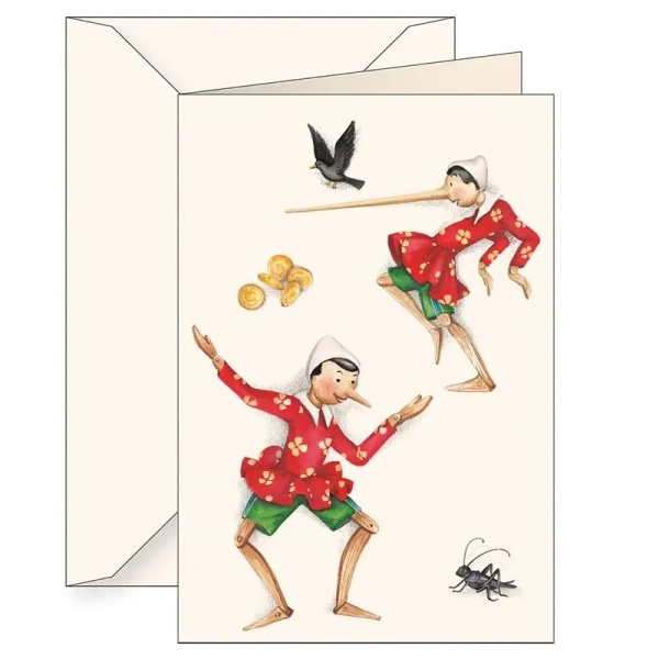 Przedstawiamy ozdobny karnet w formacie B6, który zachwyca pięknym wzorem inspirowanym klasyczną postacią Pinokio. W komplecie znajduje się dopasowana koperta. Karnet wykonany jest z wysokiej jakości papieru o gramaturze 200g/m2, gwarantującego trwałość i elegancję. Produkt powstał we Włoszech, co świadczy o jego wysokiej klasie oraz dbałości o szczegóły.