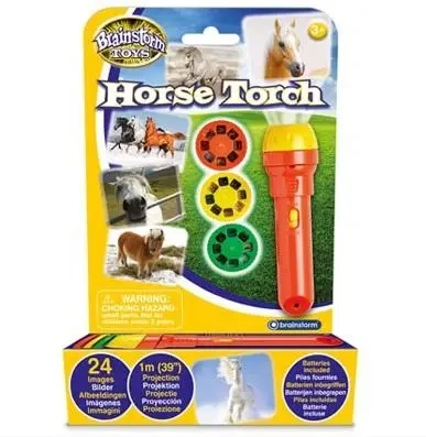 Ta poręczna latarka LED jest także projektorem fotograficznym, wyświetlającym kolorowe obrazy o szerokości do jednego metra na ścianach i sufitach..Latarka posiada 3 dyski slajdów z 24 kolorowymi fotografiami koni i kucyków 22 różnych ras. Oglądaj zdjęcia konia Shire, koni arabskich, źrebaka mustanga i nie tylko. Łatwo wymieniaj i zmieniaj slajdy, odciągając plastikową klapkę i wkładając wybrany dysk, a następnie obracaj dysk, aby oglądać fantastyczne kolorowe obrazy o szerokości do jednego metra. Obrazy można łatwo ustawić, obracając głowicę obiektywu. Może być również używana jako zwykła latarka bez założonych prowadnic i doskonale nadaje się do trzymania na stolikach nocnych, aby zapewnić dzieciom komfort w nocy. Mierzy 11 cm długości i około 3,5 cm średnicy w najszerszym miejscu. Zasilana bateriam i- 3 x LR44 załączonymi w zestawie.