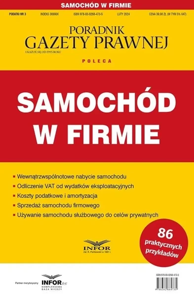 Z poradnika "Samochód w firmie" dowiesz się, jak zgodnie z prawem używać samochodu w swojej firmie i zaoszczędzić pieniądze. Przedsiębiorcy w prowadzonej działalności gospodarczej wykorzystują różne środki transportu, które są dla nich niezbędnym narzędziem pracy. Wydatki związane z ich nabyciem i eksploatacją bywają znaczne i po spełnieniu określonych warunków mogą być zaliczane do kosztów uzyskania przychodów. Niezwykle istotne, a także sprawiające przedsiębiorcom wiele trudności są kwestie związane z odliczaniem VAT od pojazdów samochodowych. Główną zaletą publikacji jest kompleksowe - i równocześnie przystępne - przedstawienie tematu w ujęciu prawnym, podatkowym i rachunkowym. Omówienie jest wzbogacone o praktyczne przykłady, tabelaryczne zestawienia i wzory dokumentów, orzeczenia sądów i pisma Ministerstwa Finansów. Z opracowania Czytelnik dowie się m.in.: jakie są zasady odliczania VAT od pojazdów samochodowych, które wydatki na samochód można zaliczyć do kosztów podatkowych, jak określić wartość samochodu użytkowanego wcześniej w celach prywatnych, jak prawidłowo zgłosić wewnątrzwspólnotowe nabycie samochodu, kiedy i na jakich warunkach można udostępnić samochód służbowy pracownikowi, zleceniobiorcy lub menedżerowi. "Samochód w firmie" to niezbędne narzędzie dla każdego przedsiębiorcy, księgowego, biura rachunkowego, doradcy podatkowego.