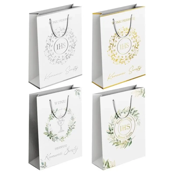 Szukasz eleganckiej torby na prezent z okazji Komunii? Nasze torby prezentowe są pięknie przyozdobione srebrną lub złotą folią, co nadaje im wyjątkowego charakteru.