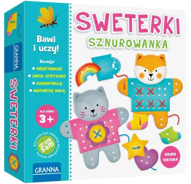 Wykorzystaj swój talent i zasoby kreatywności do stworzenia unikalnego wzoru na sweterku. Z pomocą kolorowych sznurków możesz nadać mu dowolny kształt - gwiazdy, kwiatka, a może coś zupełnie innego? Granicą jest tutaj tylko Twoja wyobraźnia. Zabawka rozwija zarówno małą motorykę, jak i zdolności twórcze.