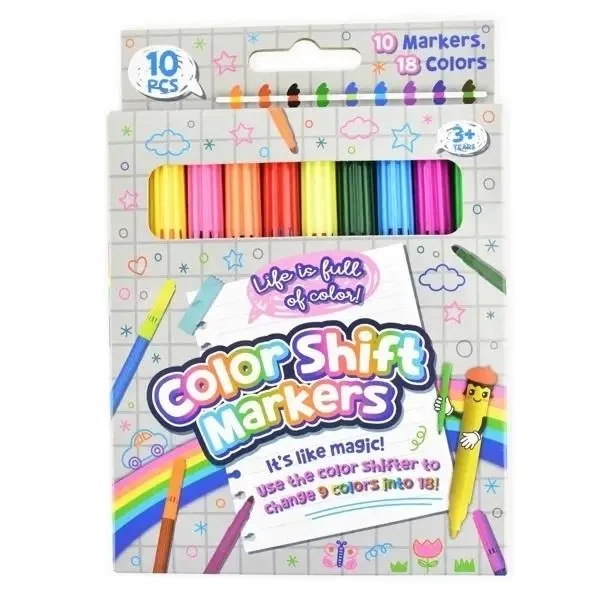 W zestawie znajduje się 8 różnokolorowych markerów oraz 2 białe pisaki, które umożliwiają zmianę kolorów. Pokoloruj rysunek, narysuj dowolny kształt i eksperymentuj z barwami za pomocą białego flamastra. Dzięki temu magicznemu mazakowi Twoje prace zyskają nową, dynamiczną formę.