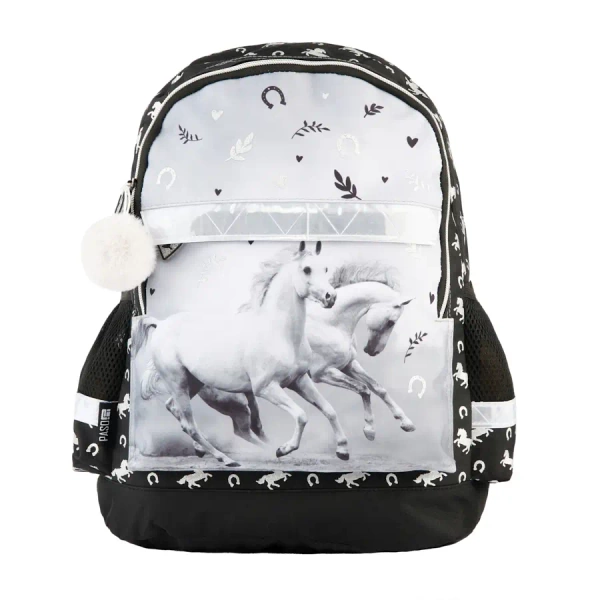 Plecak szkolny z dwoma komorami dużymi, dwoma kieszeniami na przodzie, bocznymi kieszonkami z siatki.