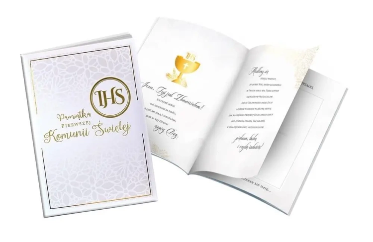 Okładka: twarda, wyściełana. Zdobienie: złota lub srebrna folia. Wnętrze: kolorowe, z grafikami, cytaty, miejsce na dedykację i wpisanie miejsca/godziny uroczystości. Dodatkowe elementy: koperta na drobny upominek wewnątrz. Okazja: komunia, Pierwsza Komunia Święta.