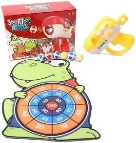 W skład oferowanego zestawu wchodzi pistolet, tarcza z haczykiem do zawieszenia oraz 6 piłek na rzep. Zabawka ma ciekawą funcję, która umożliwia ładowanie piłek do pistoletu za pomocą specjalnej klapki umieszczonej na górze pistoletu. Strzelanie przebiega w następujący sposób: najpierw pociągnij za zawleczkę zlokalizowaną z tyłu pistoletu, następnie przechyl go do przodu tak, aby piłka wpadła do komory wystrzału. Gdy już wycelujesz, naciśnij spust, a piłka przyczepi się do tarczy.