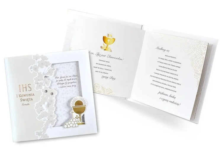 Książeczki PMB Q to produkt wyjątkowy - pięknie wydany, elegancki, zdobiony złotą oraz perłową folią, z kolorowym wnętrzem z pięknymi grafikami i cytatami oraz życzeniami i miejscem na osobistą dedykację. Na wewnętrznej stronie okładki wklejona jest specjalna, nieduża koperta, w której można przekazać kartę podarunkową lub banknot. Książeczka PMB Q Kukartka to idealny prezent na wyjątkową okazję, jaką niewątpliwie jest Pierwsza Komunia Święta.