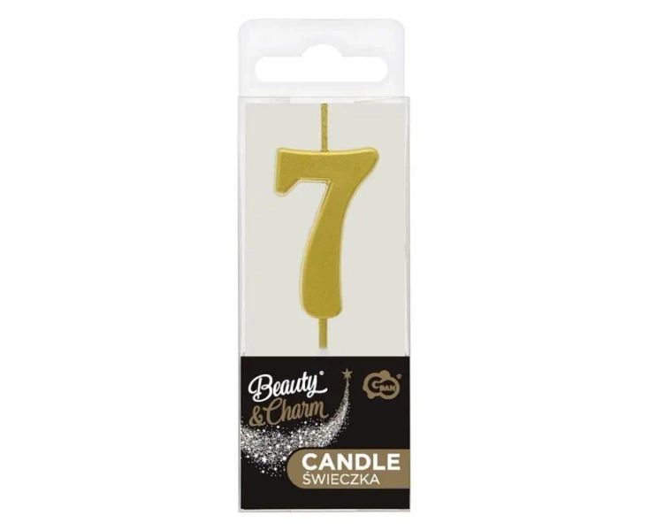 Świeczka w formie cyfry 7, wykonana w eleganckim metalicznym złotym odcieniu, idealna na różnorodne uroczystości. Doskonale sprawdzi się na tortach urodzinowych, jubileuszowych lub innych okazjach, dodając im wyjątkowego blasku. Produkt z serii Beauty&Charm od renomowanego producenta Godan S.A. Zachwyci swoją estetyką i jakością wykonania.