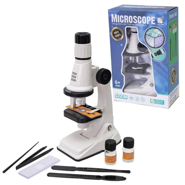 Mikroskop 2 kolory, powiększenie 200x, 600x, 1200x Zasilanie: 2xAA (brak w zestawie) Wymiary opakowania: 16.5 x 9 x 26 cm