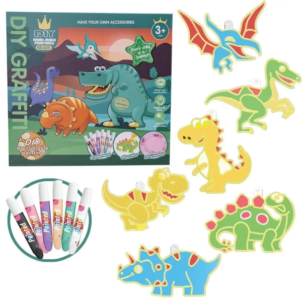 Ten zestaw kreatywny pozwala na stworzenie kolorowych dinozaurów, które mogą służyć jako ozdoby do plecaka, piórnika lub nawet jako biżuteria. W komplecie znajdują się formy, sześć kolorów żelów oraz koraliki, które umożliwiają nieograniczoną kreatywność. Zestaw zapakowany jest w pudełko o wymiarach 24.5 x 3.5 x 23 cm.