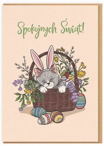 Wielkanocne jajka? Oj, to nie ta bajka! Z czym kojarzy Ci się Wielkanoc? Pisanki, zajączek, święconka, a może święty spokój? My połączyliśmy wszystkie elementy w jedno i powstała oryginalna, zabawna kartka wielkanocna. Jest to wyjątkowy prezent świąteczny lub dodatek do prezentu dla dziadka, babci oraz każdej bliskiej osoby. Jeśli chcesz podarować upominek, który wywoła uśmiech na twarzy innych, oto odpowiednie rozwiązanie. Chcesz mieć wyłączność na najbardziej urocze kartki wielkanocne? Nie kupuj kota w worku, wybierz tego w koszyczku! Kartka to idealny prezent na Wielkanoc. Kartka okolicznościowa na Wielkanoc SPOKOJNYCH ŚWIĄT! Wymiary kartki (po złożeniu): 12 cm x 17 cm Gramatura papieru: 250 g/m2 W zestawie elegancka koperta z eko kraftu Wymiary koperty: 12,5 cm x 17,5 cm Gramatura koperty: 100 g/m2 Zestaw zapakowany w folię Idealna kartka na Wielkanoc Wyprodukowano w Polsce