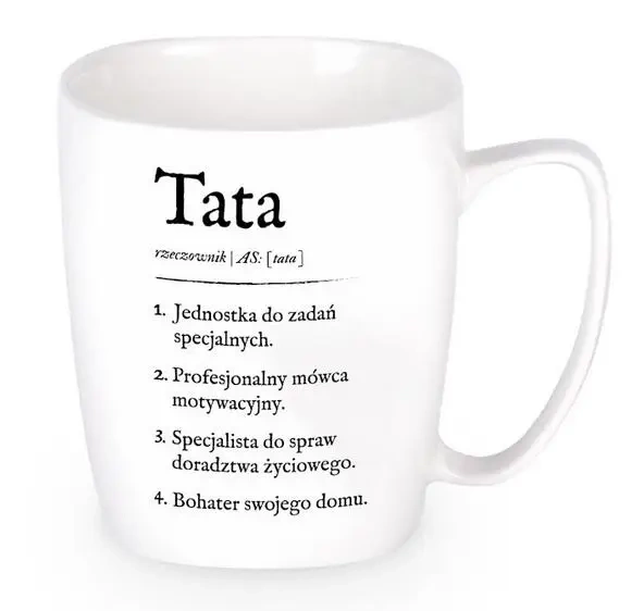 Tata: To człowiek wielozadaniowy. Charakteryzuje się umiejętnościami motywacyjnymi oraz doradczymi. Prawdziwy bohater w domowym zaciszu. Czy opis ten oddaje charakter Twojego taty? A może warto dodać jeszcze kilka cech? Oryginalny kubek do kawy z napisem TATA będzie znakomitym pomysłem na prezent!