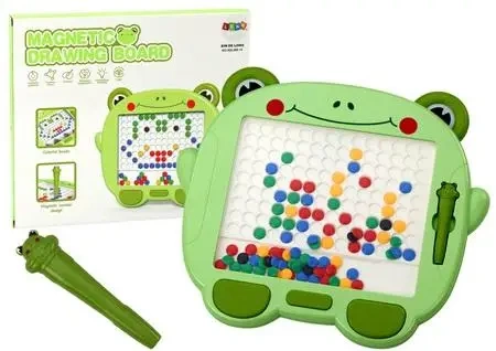 Tablica zawiera dużą, białą planszę z wypustkami, idealną do układania koralików magnetycznych. Te kolorowe koraliki - dostępne w odcieniach czerni, niebieskiego, żółtego, czerwonego oraz zielonego - pozwalają tworzyć różnorodne wzory i obrazki. Dzięki przezroczystej ściance chroniącej rysunek, dzieci mogą swobodnie aranżować swoje kompozycje za pomocą specjalnego rysika magnetycznego z motywem żabki.