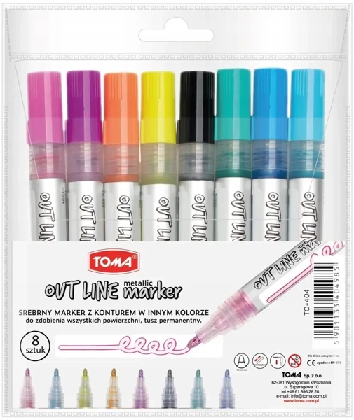 Przedstawiamy MARKER OUTLINE TO-404 w zestawie 8 różnorodnych kolorów. Te markery mają fibrową końcówkę o grubości 2,5 mm, zanurzoną w permanentnym tuszu. Centralna część linii jest zawsze srebrna, a obwódka w innym kolorze, co czyni je idealnym narzędziem do zdobienia wszelkich powierzchni. Dzięki srebrnym, metalicznym cząsteczkom uzyskuje się niesamowite efekty wizualne.