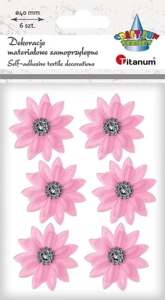 Prezentujemy unikalną kolekcję samoprzylepnych dekoracji w formie materiałowych kwiatów 3D. Każdy z nich ma średnicę 40 mm i pyszni się delikatnym różowym kolorem wzbogaconym o błyszczący kryształek.
