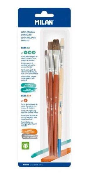 Ten zestaw zawiera cztery sztuki płaskich pędzli szkolnych z serii 121 oraz jeden pędzel z serii 524. Pędzle z serii 121 obejmują numery 4, 10 i 16, natomiast pędzel z serii 524 ma numer 8.
