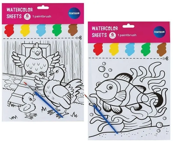 Kolorowanka z pędzelkiem oraz farbkami. Kolorowanka zawiera 6 obrazków, rozmiar 21 x 29,7 cm