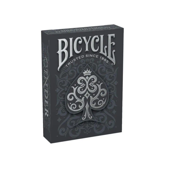 Bicycle Cinder to talia kart inspirowana urokiem i tajemniczością dymu z ogniska. Karty te wyróżniają się popielatymi odcieniami szarości oraz elegancką, srebrną folią. Podwójne tłoczenia tworzą efekt trójwymiarowy, a niestandardowa plomba zamykająca dodaje unikalności.