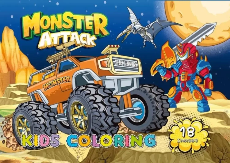 Kolorowanka dla dzieci. Na każdym z 18 obrazków znajduje się obrazek z monster truckiem, który tylko czeka żeby nabrać kolorów. Wyprodukowana na Ukrainie.