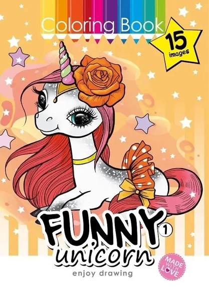 Kolorowanka dla dzieci w której znajduje się 15 obrazków z jednorożcami, które tylko czekają żeby nabrać kolorów. Wyprodukowana na Ukrainie.