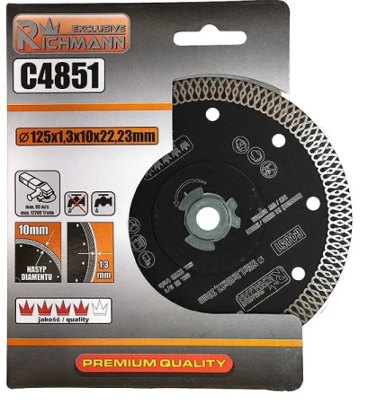 Tarcza tnąca diamentowa cienka - 125 mm - Richmann Exclusive C4851 Warto wiedzieć: cienka tarcza diamentowa przeznaczona do cięcia materiałów takich jak: klinkier, glazura, gres, marmur, granit, dachówka przeznaczona do cięcia materiału przy użyciu szlifierki kątowej średnica tarczy wynosi: 125 mm, grubość: 1,3 mm, otwór: 22,23 mm, powierzchnia diamentowa 10 mm specyficzny profil obrzeża diamentowego pozwala na cięcie z dużą prędkością najtwardszych materiałów bez uszczerbku dla jakości wykończenia tarcza tylko do cięć prostych, nie zalecana do ukosowania posiada otwory wspomagające chłodzenie podczas pracy do cięcia na sucho i mokro jakość premium Parametry techniczne tarczy C4851: do pracy: na sucho/mokro średnica tarczy: 125 mm średnica otworu: 22,23 mm grubość tarczy: 1,3 mm powierzchnia diamentu: 10 mm max. prędkość obrotowa: 12200 obr/min max. prędkość chwilowa na krawędzi zew. tarczy: 80 m/s elementów w zestawie: 1 szt. w waga: 118 g waga z opakowaniem: 145 g wymiary opakowania (wys./szer.): 170/155 mm